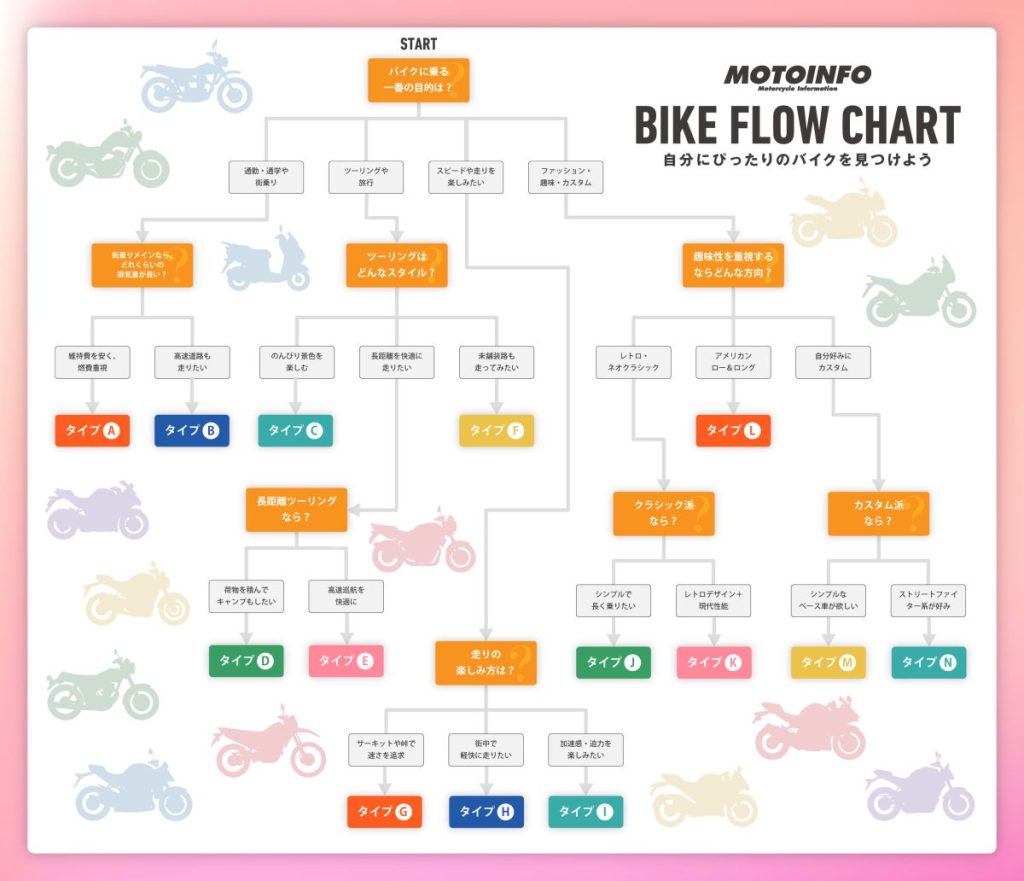 そこで今回は、いくつかの質問に答えるだけで、自分に合うバイクのタイプが見えてくる「簡単診断フローチャート」を用意しました。これからバイク選びを始める方のヒントとして、ぜひ気軽に試してみてください。