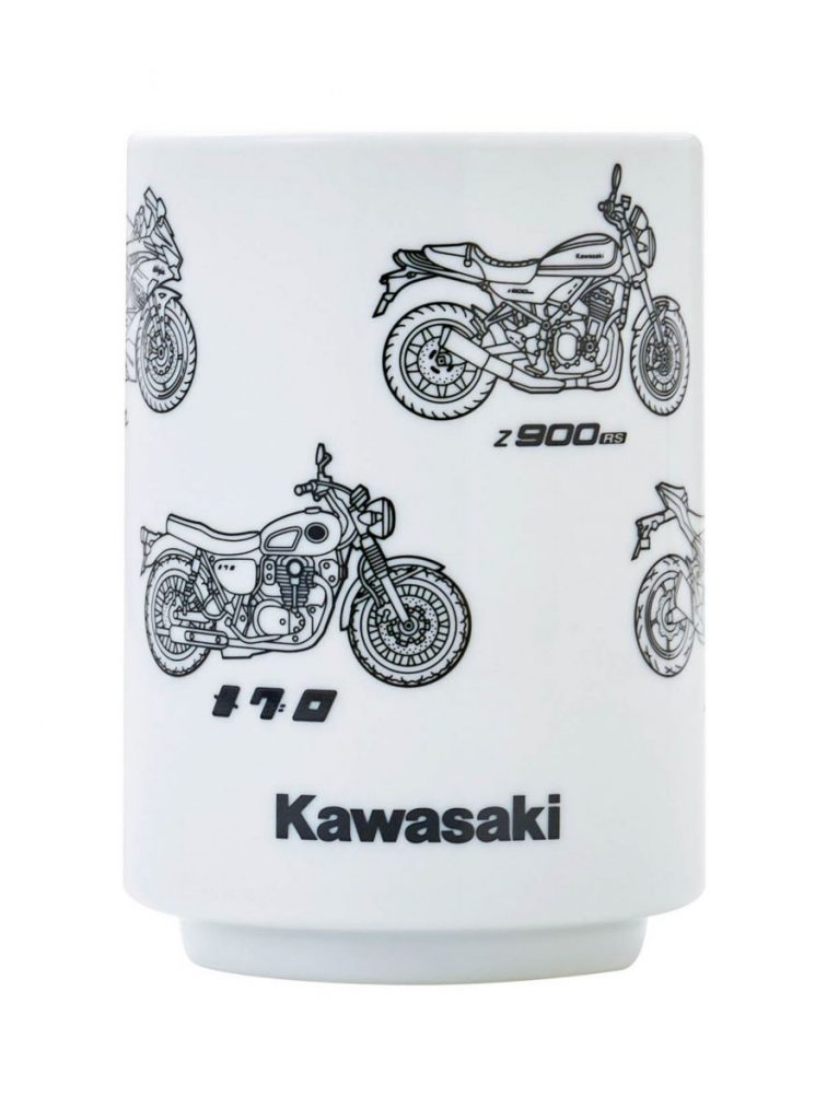 「メグロ」や「Z900RS」といった現行車種から歴史的なバイクまで、カワサキの主要モデルの線画がデザインされた美濃焼の湯呑みです。ブラックとホワイトの2点セットで電子レンジ対応。お茶を飲みながら、湯呑みの表面に描かれた名車たちをゆったりと眺める贅沢な時間を楽しめます。