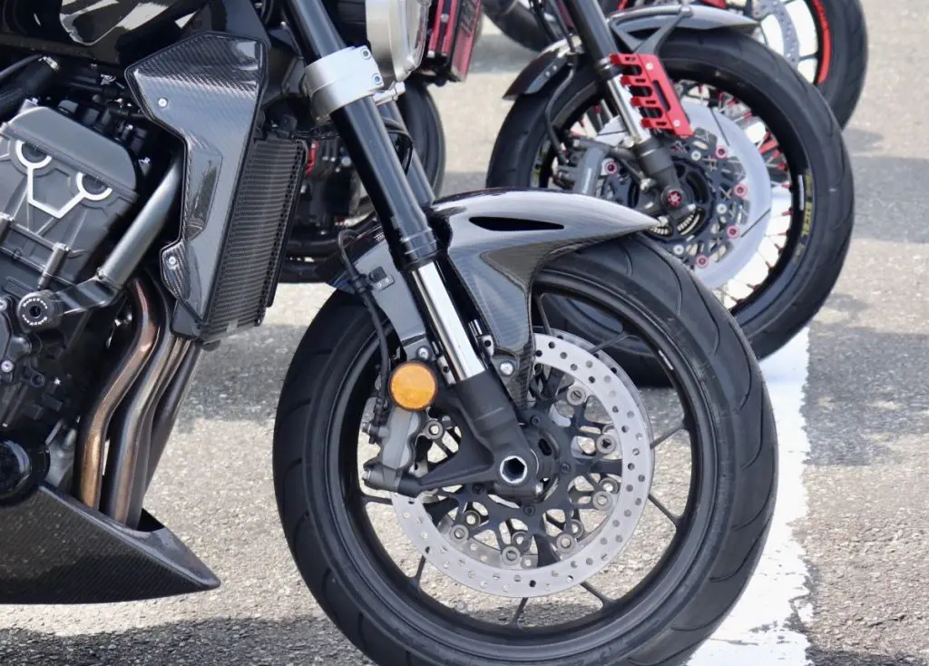 ちなみに、通常アウターチューブが下にある「正立フォーク」が主流で、高性能車やオフロード車にはアウターチューブが上にある「倒立フォーク」が採用されているモデルもあります。倒立フォークは剛性やハンドリング性能の向上に寄与しますが、価格が高く傷がつきやすい場合もあります。