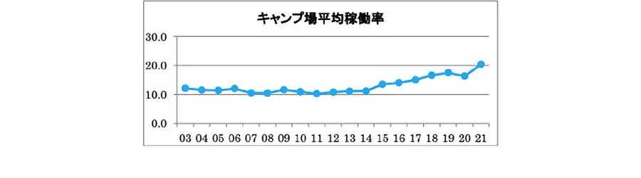 コロナが猛威を振るった2020年を除き、2014年から徐々に平均稼働率を上げるキャンプ場。