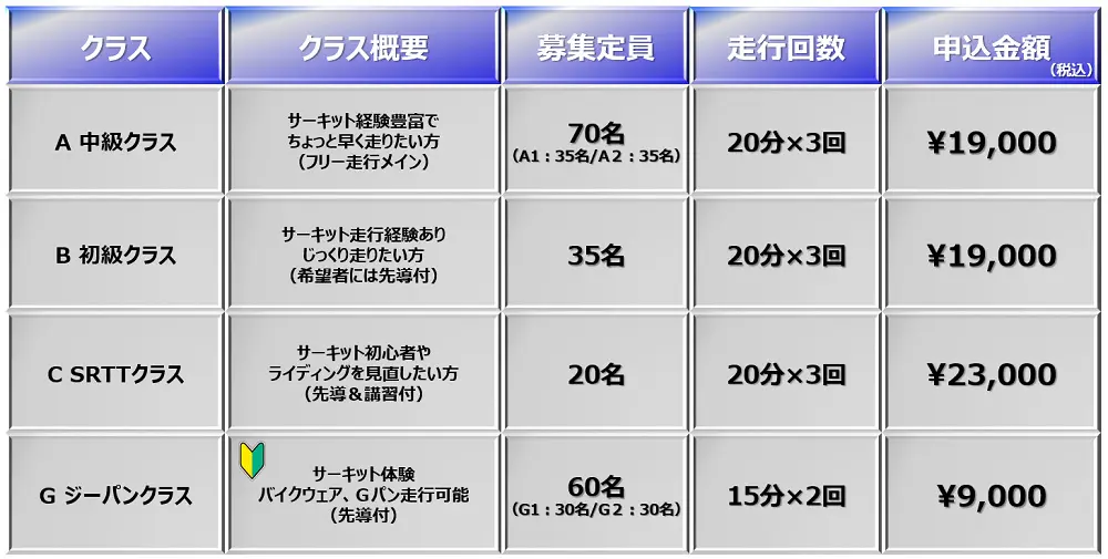 走行のクラスは大きく分けて3つ。さらにサーキット経験者を中級(A)・初級(B)クラスに分けています。本気モードで走りたいライダー(A・B)から、まずはサーキット体験として本格的な装備を購入する前に走ってみたいライダー(G)まで、幅広い参加希望者を受け入れていました。その中間にあるSRTTクラス(C)では、プロライダーが先導して走行ラインやライディングの指導を受けながら走行ができるカリキュラムとなっています。