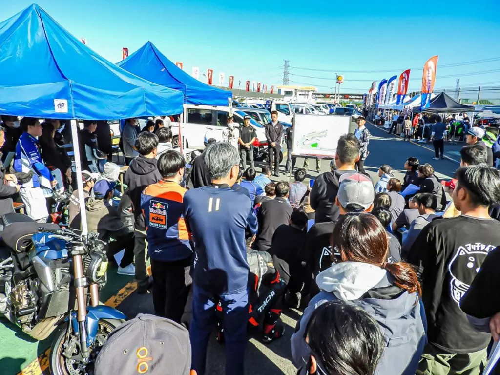 10時からの走行前ブリーフィングでは、ガソリンや空気圧の確認から、走行時間内のフラッグについての説明、万が一の転倒後の行動についてなど、細かなルールをわかりやすく説明されており、参加するライダーたちは真剣に耳を傾けていました。