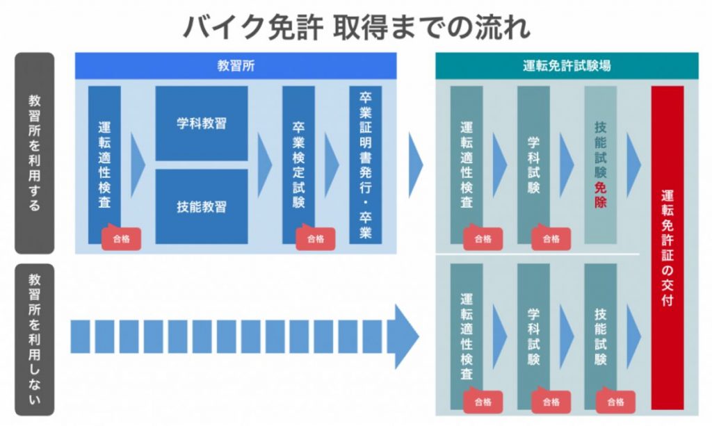 すでに四輪車の免許や、小型二輪免許、普通二輪免許を取得している人は「履修済み」として学科教習が免除され、受講料もリーズナブルになります。