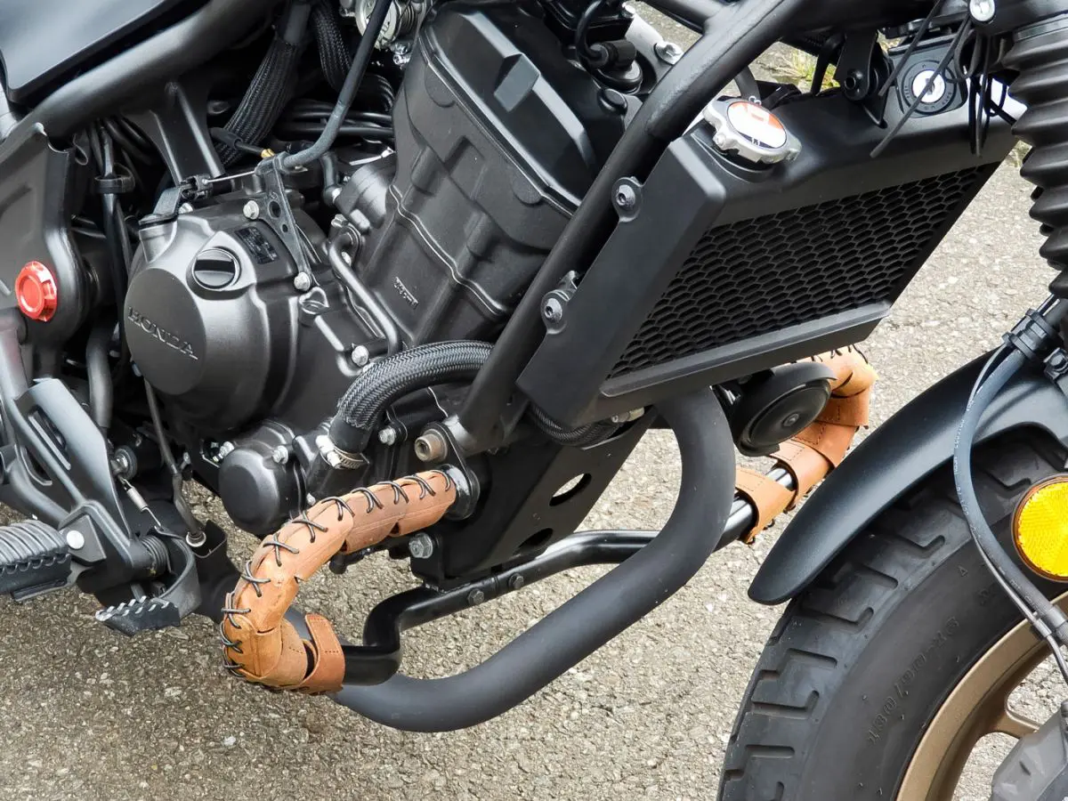 こちらのユーザーもエンジンガードへのキズ防止とドレスアップを兼ねて革製のガードを巻いている