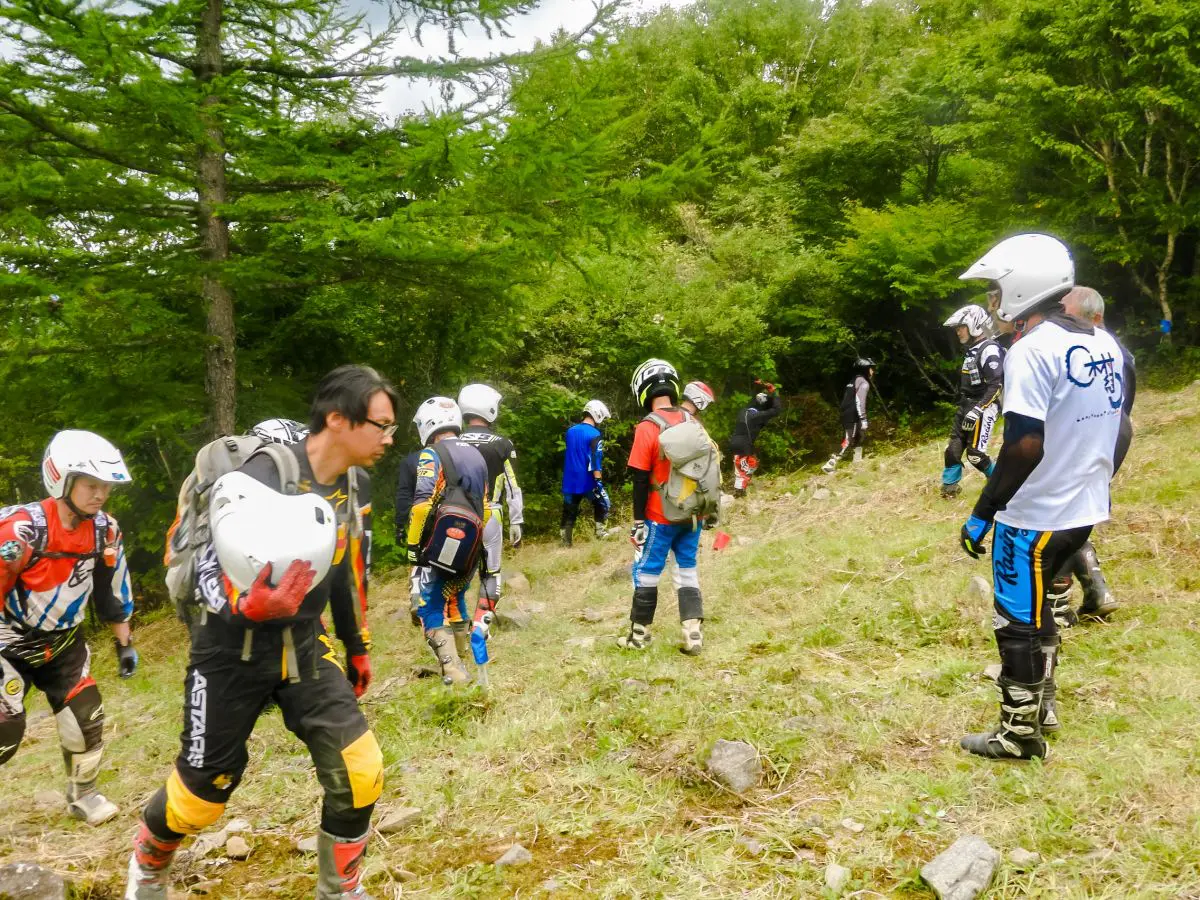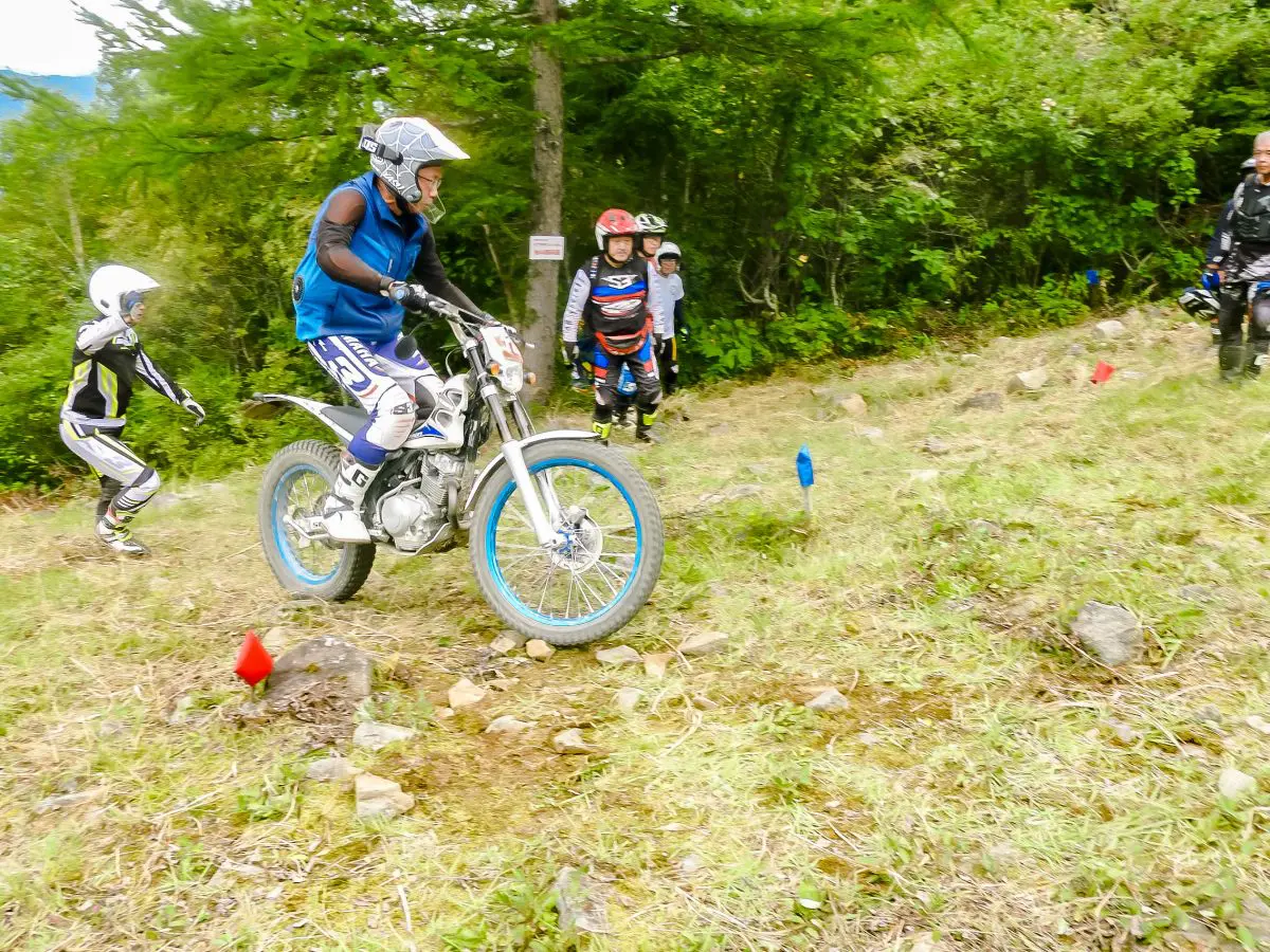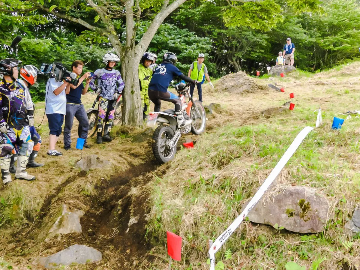 各セクションとも入り口と出口が設定されており、コース内には自然の地形を活用した勾配や障害物があります。そこをバイクで走行し、どれだけ足を着かずに走り抜けられるかという減点方式(ミスなし=0点)のシンプルなルール。エンジンストップや転倒、あるいはバックをしてしまうと、そのセクションは最多減点の5点が付いてしまいます。