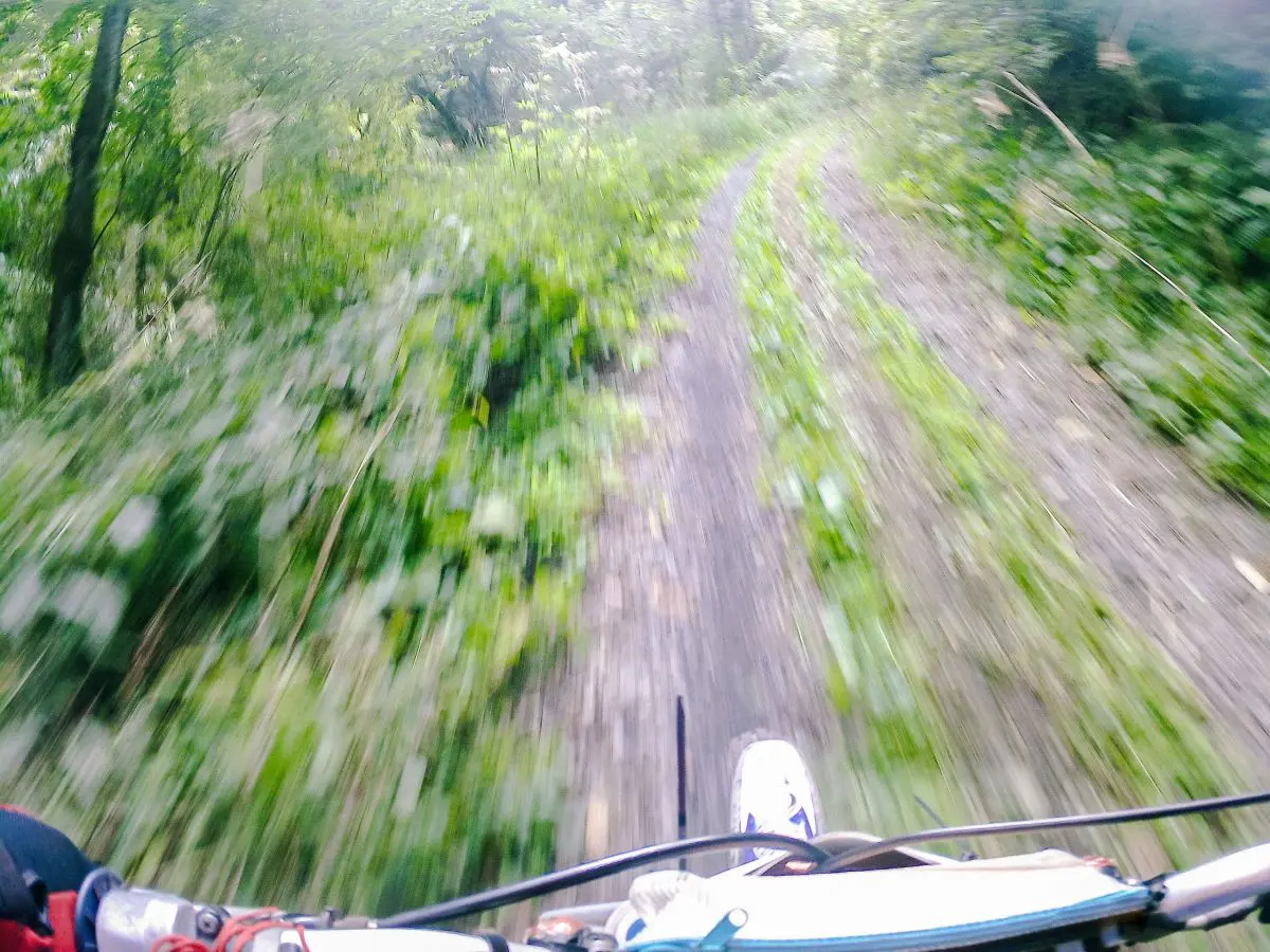 陽の光が差し込む林道は明暗のコントラストが強いため、路面の変化を見落とすこともあり、泥の水たまりや大きめの石が転がる場所などでは転倒する人も少なくありません。ただし、林道走行は比較的低速走行であるため、多くの場合は打撲程度で済むのが救いです。
