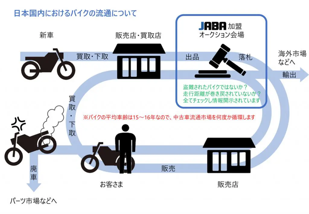 オークションにおける一般的な流れは、ユーザーがバイクショップなどから新車や中古でバイクを購入し、その後、新しい車両への乗り換えや不要になったなどの理由からバイクショップへ売却をします。ユーザーから車両を買い取ったバイクショップは、自店での販売や、オークションへ車両を出品します。オークションへ出品し、成約すれば落札したバイクショップへ車両が渡り、落札したバイクショップは車両の整備を行い、次のユーザーへ販売する、こうした流れになります。