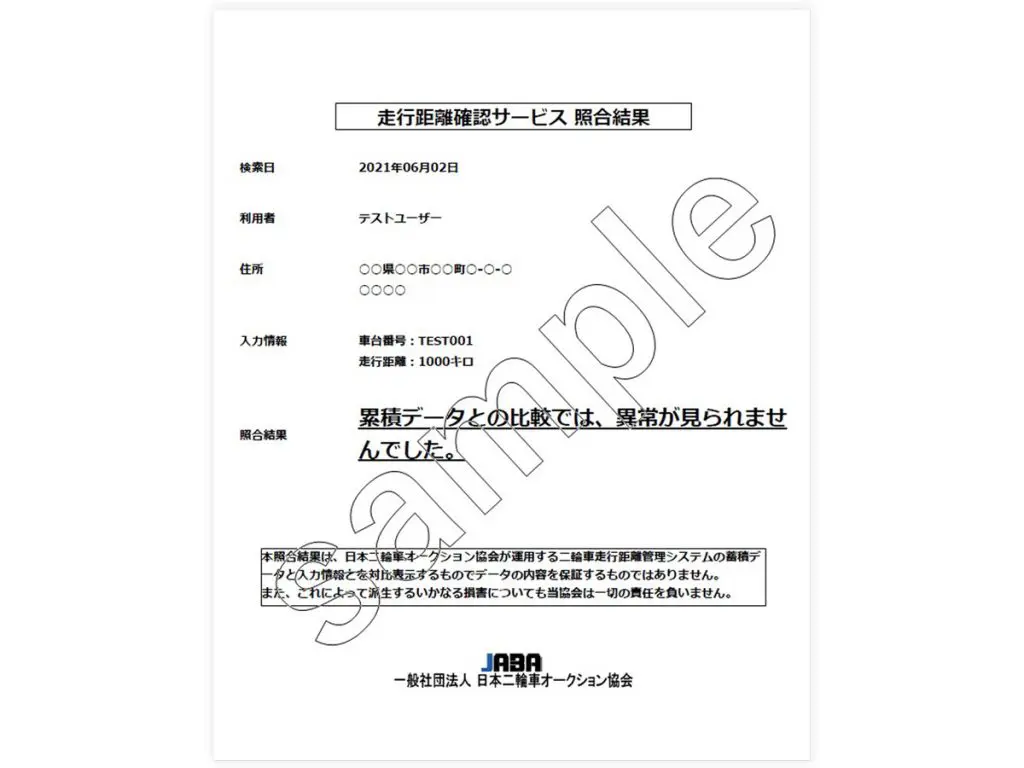 ※照合結果は日本二輪車オークション協会が運用する二輪車走行距離管理システムに蓄積されたデータと利用者が入力したデータを対比した結果表示であり、当該車両の積算走行距離数及び車両の状態を保証するものではありません。