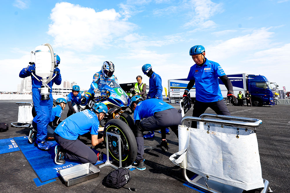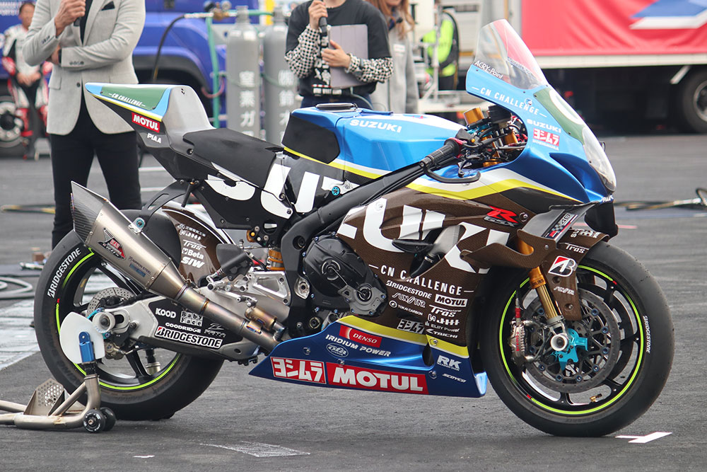 「チームスズキCNチャレンジは、2024年から実験車を用いるEXPクラスで参戦しています。環境負荷を低減しつつレースをするという取り組みですね。燃料はもちろん、カウリングやタイヤ、ブレーキなど、いろいろなところに環境に優しいものを使っています。今年は転倒などもあり、総合33位という結果に終わりましたが、カーボンニュートラルの先駆者として、来年も参加できたら嬉しいですね」(津田選手)