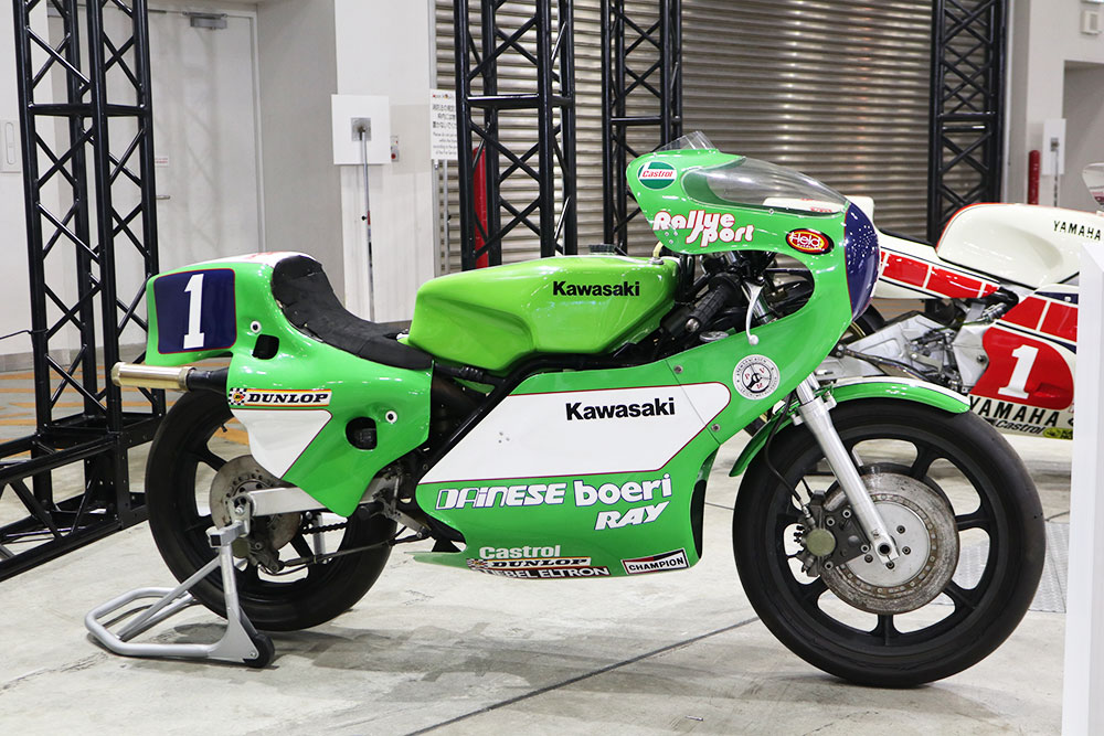 WGP(World Grand Prix / ロードレース世界選手権)350ccクラスにおいて、1978年、1979年、1981年、1982年にチャンピオンを獲得したのがカワサキ「KR350」です。展示されていたのは、350ccクラスの最終年である1982年モデルで、水冷2ストローク・タンデム2気筒エンジンを搭載しています。