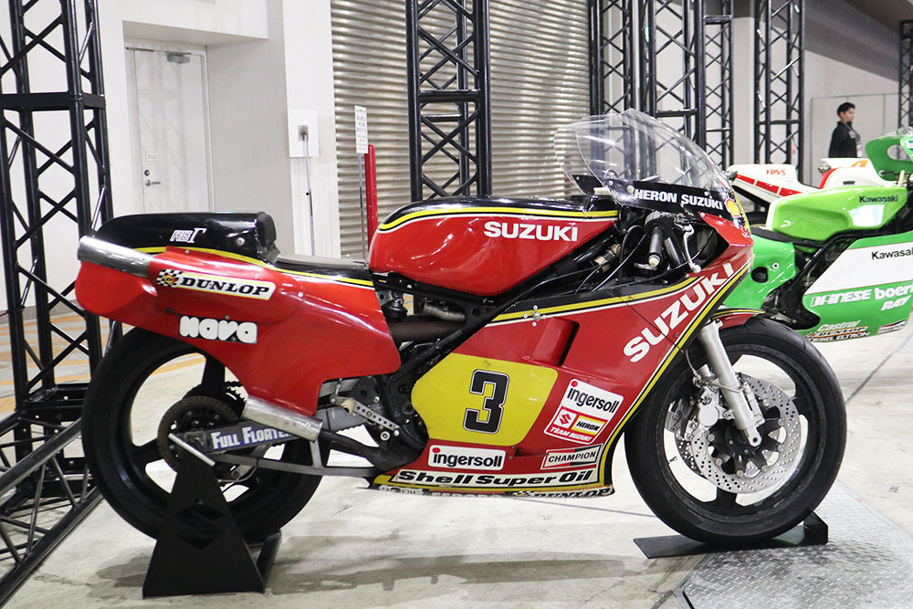 1981年のWGPで11戦中8勝を挙げた最強のマシン、それがスズキ「RGΓ」(アールジーガンマ)です。エンジンは水冷2ストローク・スクエア4気筒で、126PSもの最高出力を誇ります。前年までのレーサー「RGB」から15kgもの軽量化を果たし、マルコ・ルッキネリ選手がチャンピオンを獲得しました。展示されていたのはランディ・マモラ選手が乗車していたモデルです。