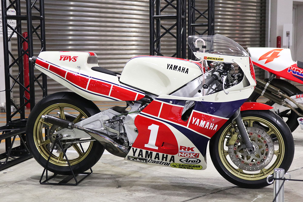 WGP1973年シーズンに登場したヤマハ「YZR500」。水冷2ストローク並列4気筒エンジンから、1981年によりパワフルなスクエア4気筒エンジンとなり、1983年には2軸クランクのV型4気筒エンジンへと進化しました。展示車両は、平 忠彦選手が全日本ロードレース選手権500ccクラスで2連覇を達成した1984年モデルです。