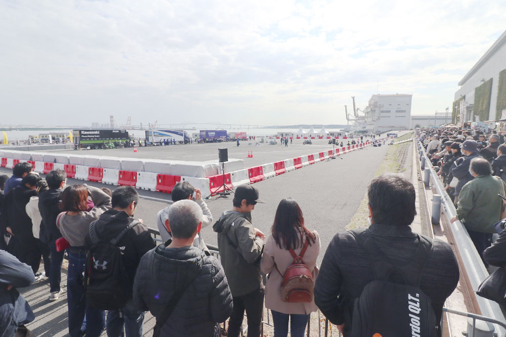 東棟屋外臨時駐車場という限られたスペースで、鈴鹿8耐参戦レーサーが周回します。津田選手は路面温度が低いなかでも果敢に膝を擦る高度なライディングを披露。岩戸選手は、コース内に隠しておいたカワサキのキャップを観客席に投げ入れるなど、来場者を楽しませました。