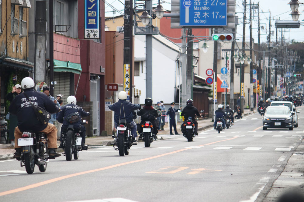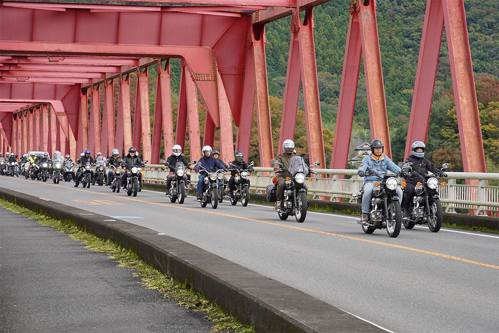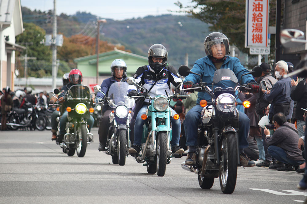 第1回から行われているのが、風光明媚な那須烏山市の那珂川周辺を一周するパレードランです。およそ13kmのルートを30分ほどかけて走るもので、車種を問わず参加は自由。旧メグロ、新メグロなどグループに分かれてメグロの聖地 那須烏山を周遊します。