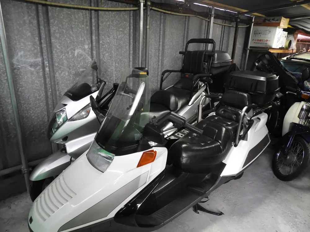 走行シーンを後ろから追走して撮影するクルマ・バイクの特殊な装備や補強など、都度アクションシーンの依頼に応じて準備するため、社内には特殊装備車両が多数保管されている。