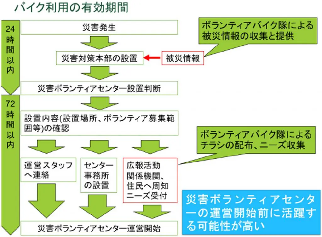 - 72時間以内の活動…情報収集の役割→次に緊急の物資輸送→地域住民への広報活動