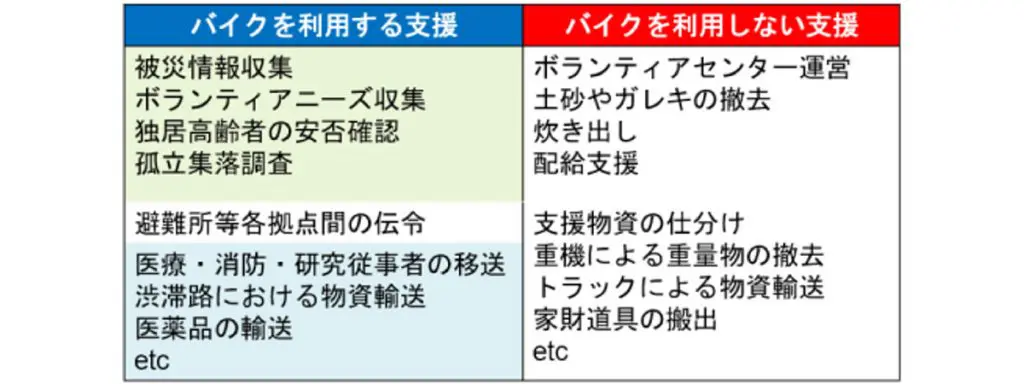 また、ボランティアバイク隊に求められる支援内容は、被災地の道路交通整備や大型家具の移動、支援物資の搬送といった活動よりも、各地・各人のボランティアニーズ収集や、孤立集落の調査、時には独居高齢者の安否確認など、迅速な情報収集が期待されます。
