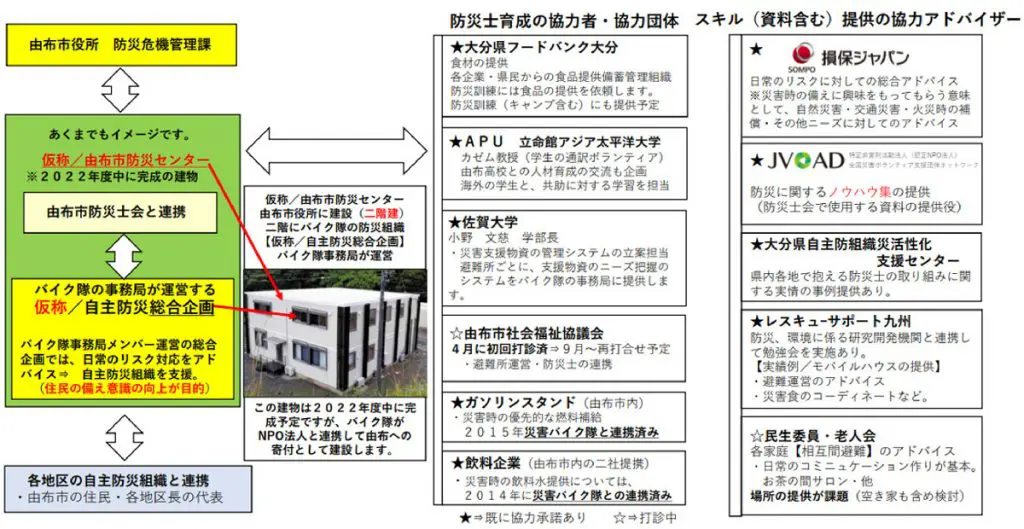 由布市バイク隊は、由布市役所防災危機管理課や由布防災士会と強固な連携が確立しており、将来的には“自主防災企画”を運営する構想を自治体に提案しています。