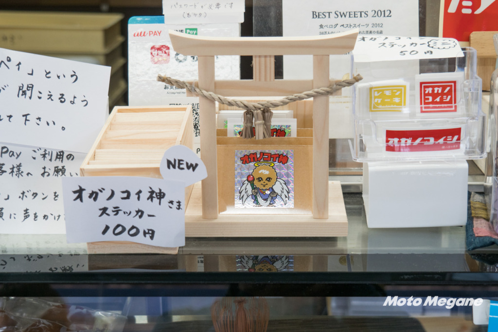 店内には名物のオガノコイシの他にも和菓子が並びますが、ひときわ異彩を放っているのがTシャツやキャップ、ステッカーなどのグッズ類。