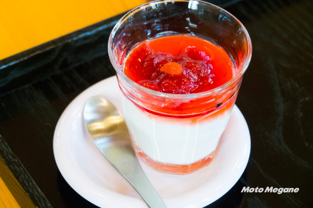 杏仁プリンに添えられたイチゴソースは秩父産の「よつぼし」という品種。