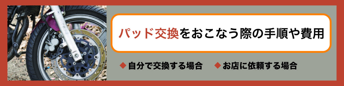 ブレーキパッド交換はバイクショップやバイク用品店、修理工場などに依頼すると確実であり、安全面を考慮すると多少の費用がかかってでも、依頼することが推奨されます。