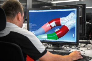 こちらはパイプを曲げるためのハイドロフォーミング。パイプの中に水を入れ、曲がる部分を凹ませないようにしている。
