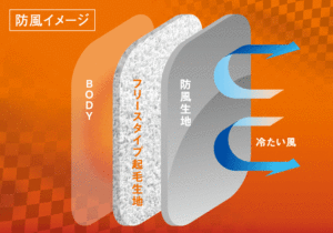 この防寒インナーシリーズは風が当たる「前面」を防風仕様にしたもので、ライディングウエアの下に着用したり組み合わせをすることで、すきまから侵入する冷たい風を防ぐことができます。