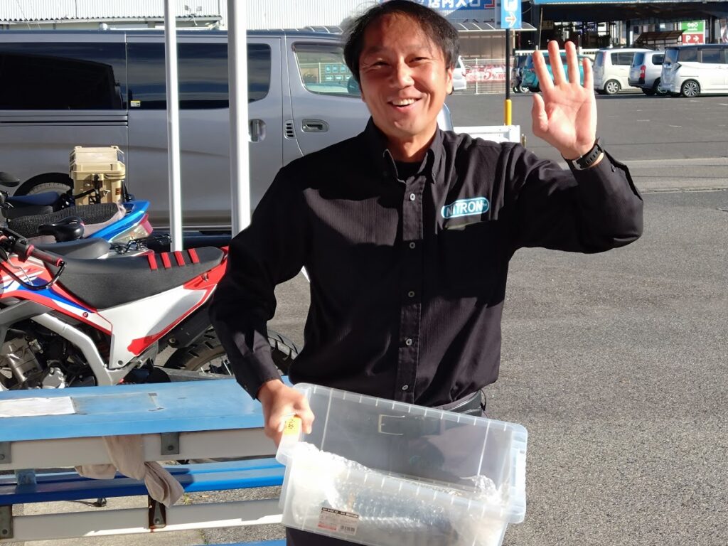 ブツ片手にさわやかな笑顔で、さっそうと彼は現れた。(笑) 実は彼、元々有名なレーサー。SUPER MOTOの全日本チャンピオンも獲得しているすごい人。そんな彼が作る(開発する)サスペンションがおかしなことになるはずがない。何ならワタクシと年齢も同じ。勝手な親近感がワガママを増幅させるのであるwww
