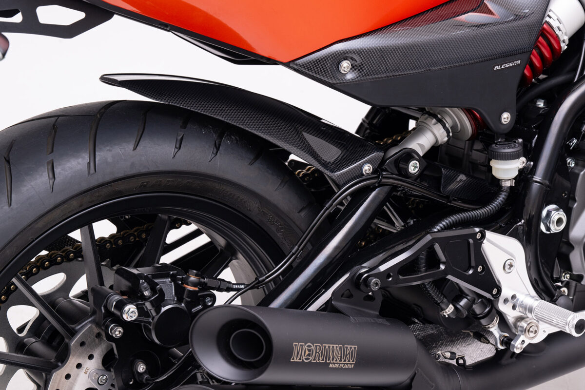 純正よりラウンドした形状のカーボン製リアフェンダー。純正チェーンガードとの同時装着可能。