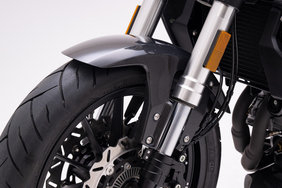 純正よりエッジを効かせたデザインのカーボン製フロントフェンダー。