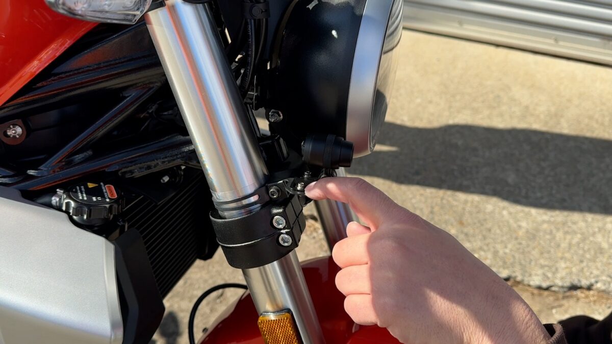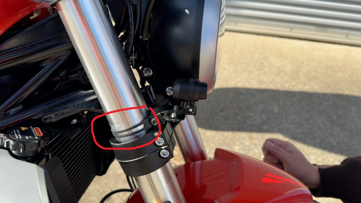 前側はフロントフォーク(フォーク径Φ52㎜)に取り付けるタイプからPLOT ドラレコカメラステー フォーククランプタイプ φ49-φ54 を使います。