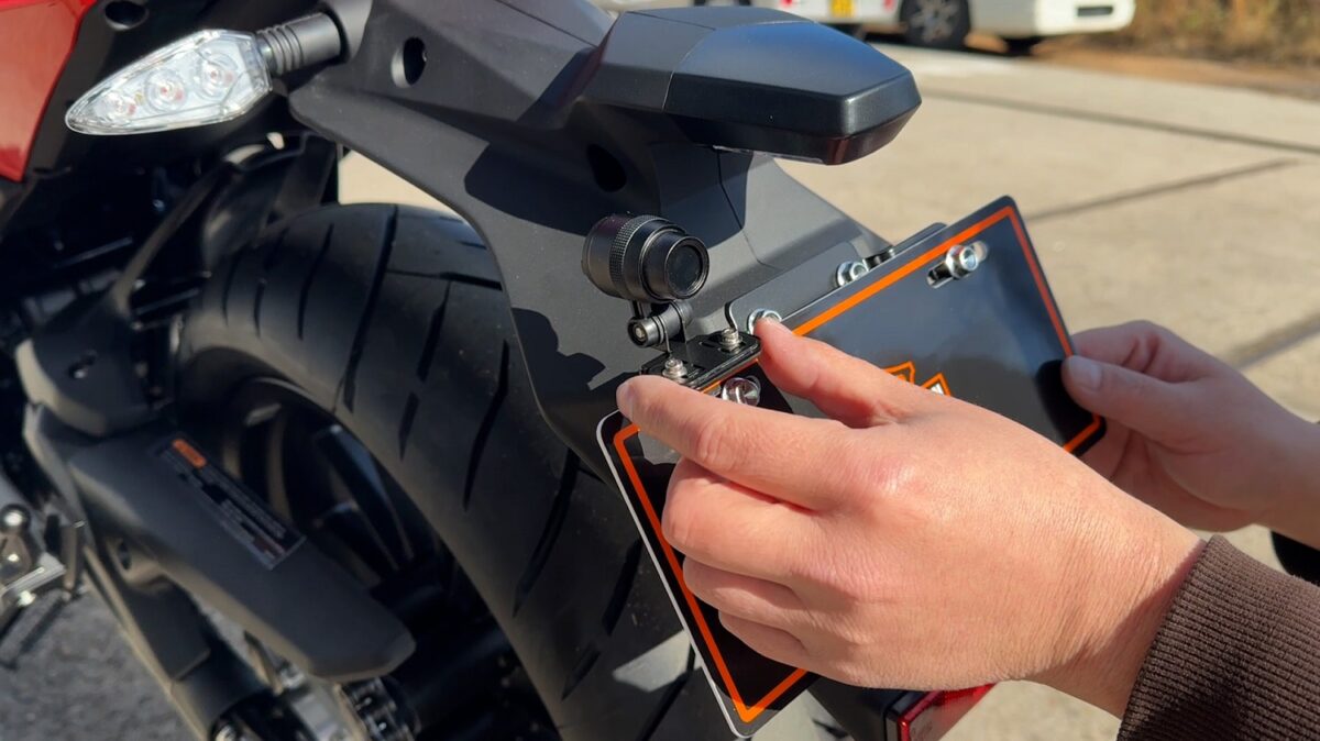 リアはナンバープレート台に挟み込んで使うPLOT ドラレコカメラステー ナンバー左上 マウントタイプを使います。カメラ位置は左右微調整が可能です。