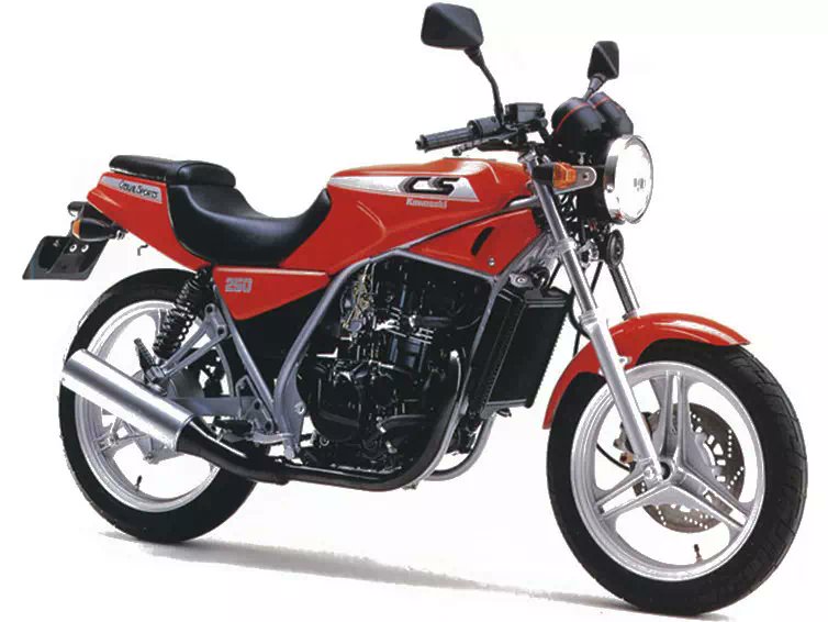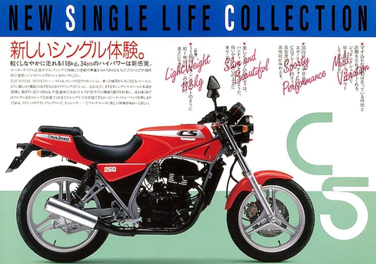 「カワサキ・250 CS 」はレーサーレプリカブーム真っ盛りの時代に登場しました。車名は「Casual Sports」の略で、その名の通り気軽に乗れることをコンセプトにしています。パワーユニットは、ダートバイクKL250Rの水冷4ストDOHC4バルブエンジンを流用。キャブを大径化することで28ps/9000rpmから34ps/10000rpmへと大幅にパワーアップし、二次減速比をハイギヤード化しています。