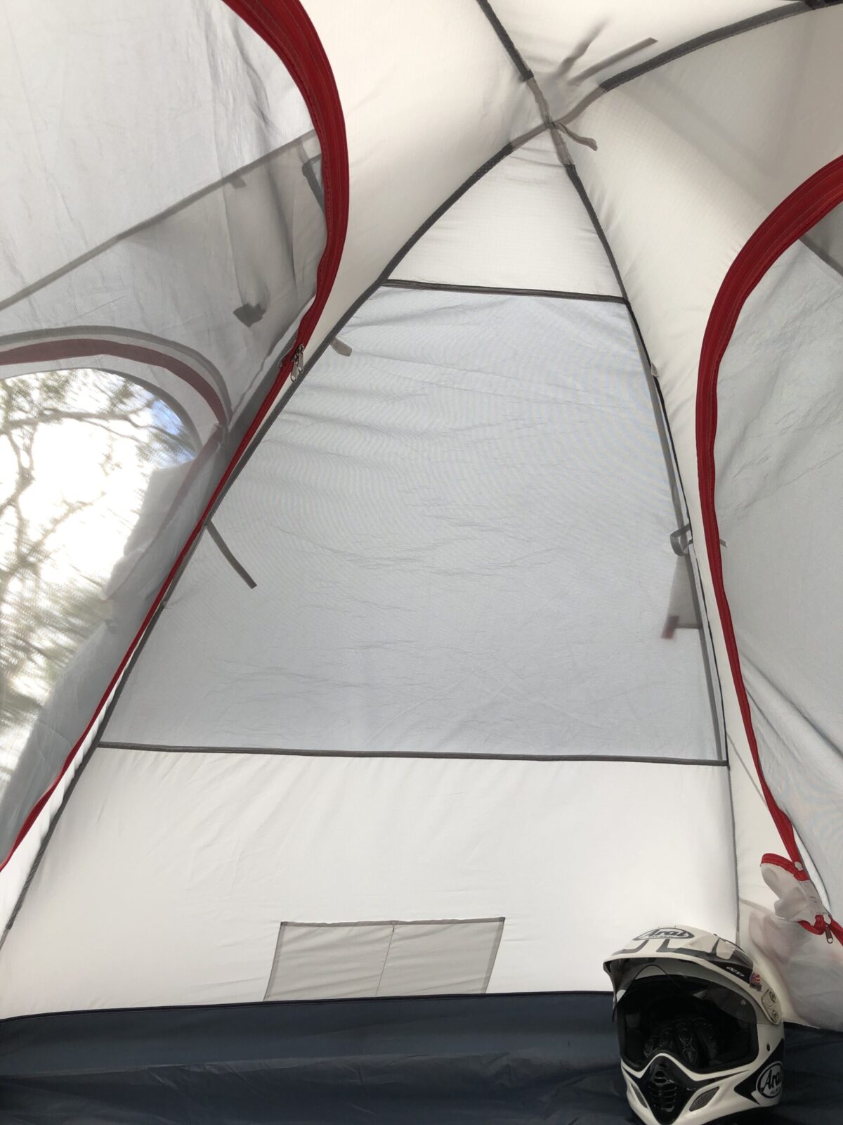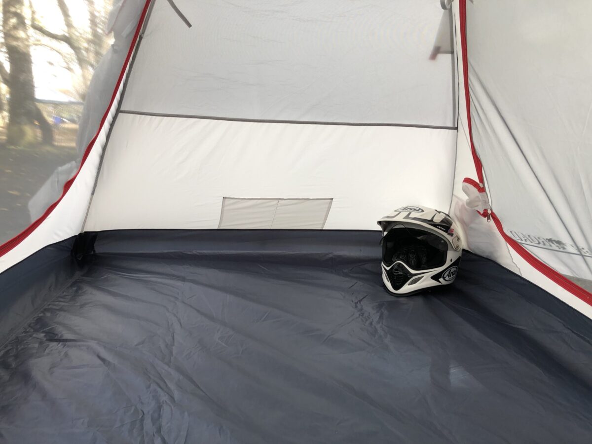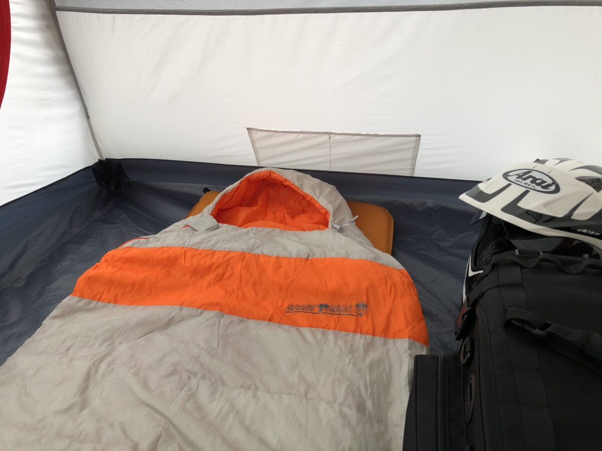 次に本体内部の詳細説明です。フロア部分の大きさは210×140cm。2人用としていますが荷物の多いキャンツーライダーは1人使用がおススメです。
