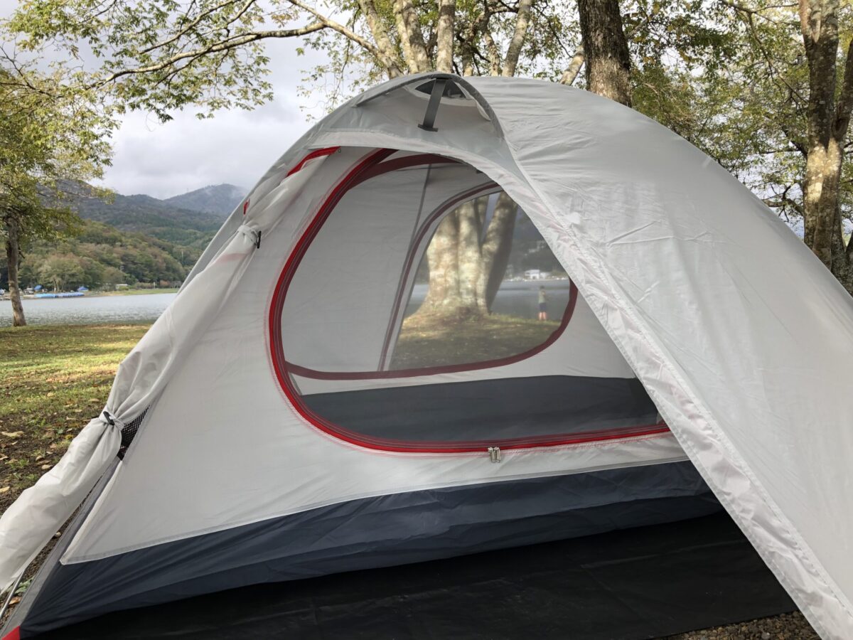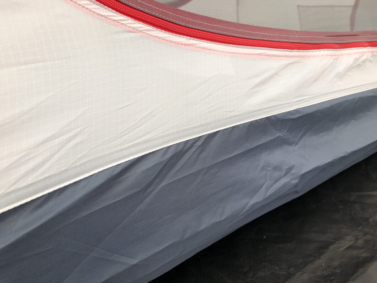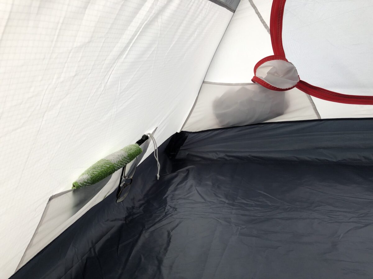 こだわりは室内側にもたくさんあります。まずは奥行き80cmの前室が前後にあり、RR5956のグランドシートを使うと片側40cm分が床アリで使用できます。テントに出入りする際、靴の脱ぎ履きに意外と便利なスペースです。