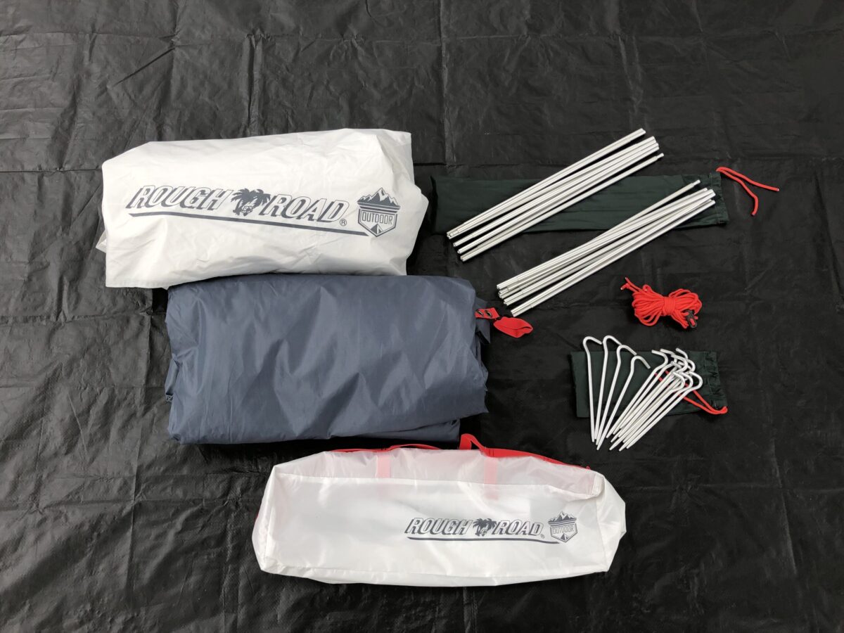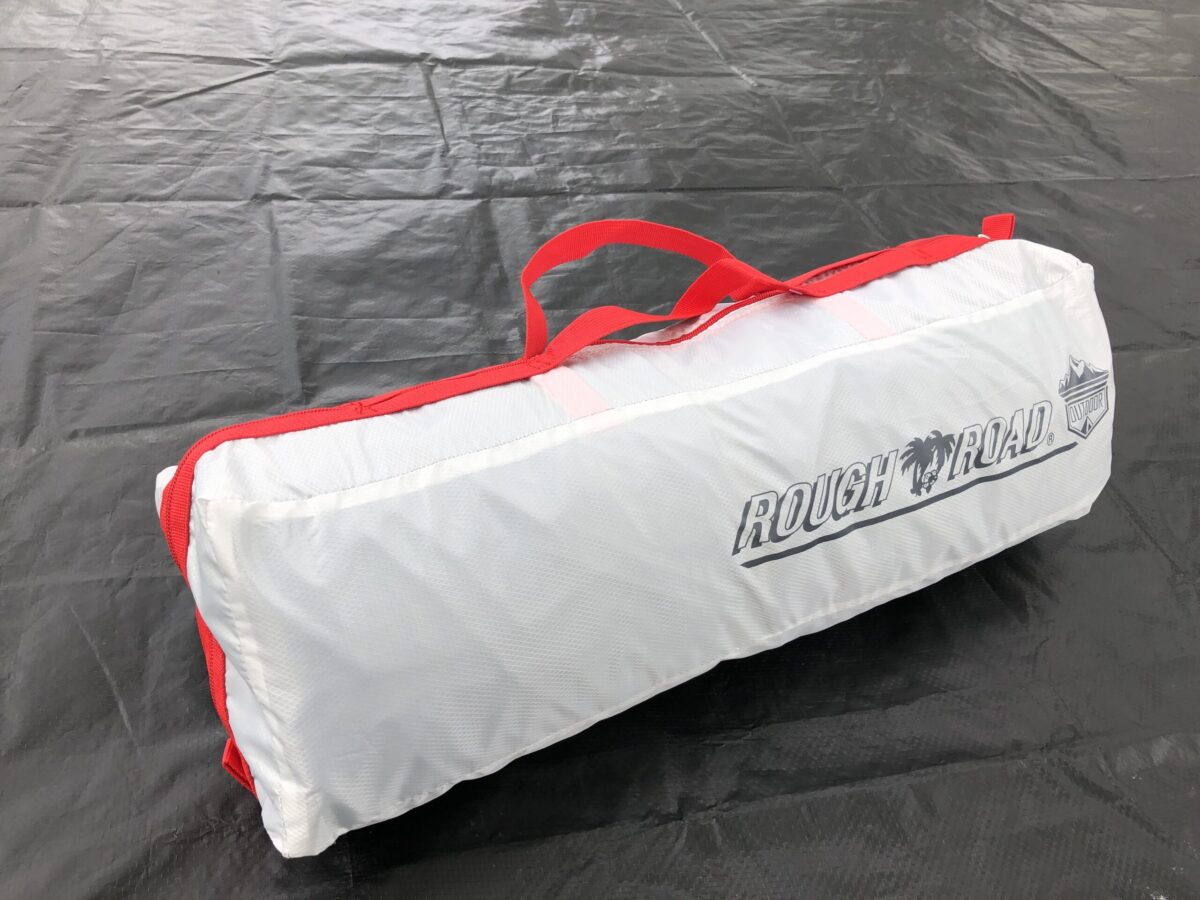 そして次にテントを広げましょう。RR5954 ラフツーリングテント 初回ロットの色はクールグレー×レッド。バイク積載時のサイズにこだわり収納サイズは13×14×50cm