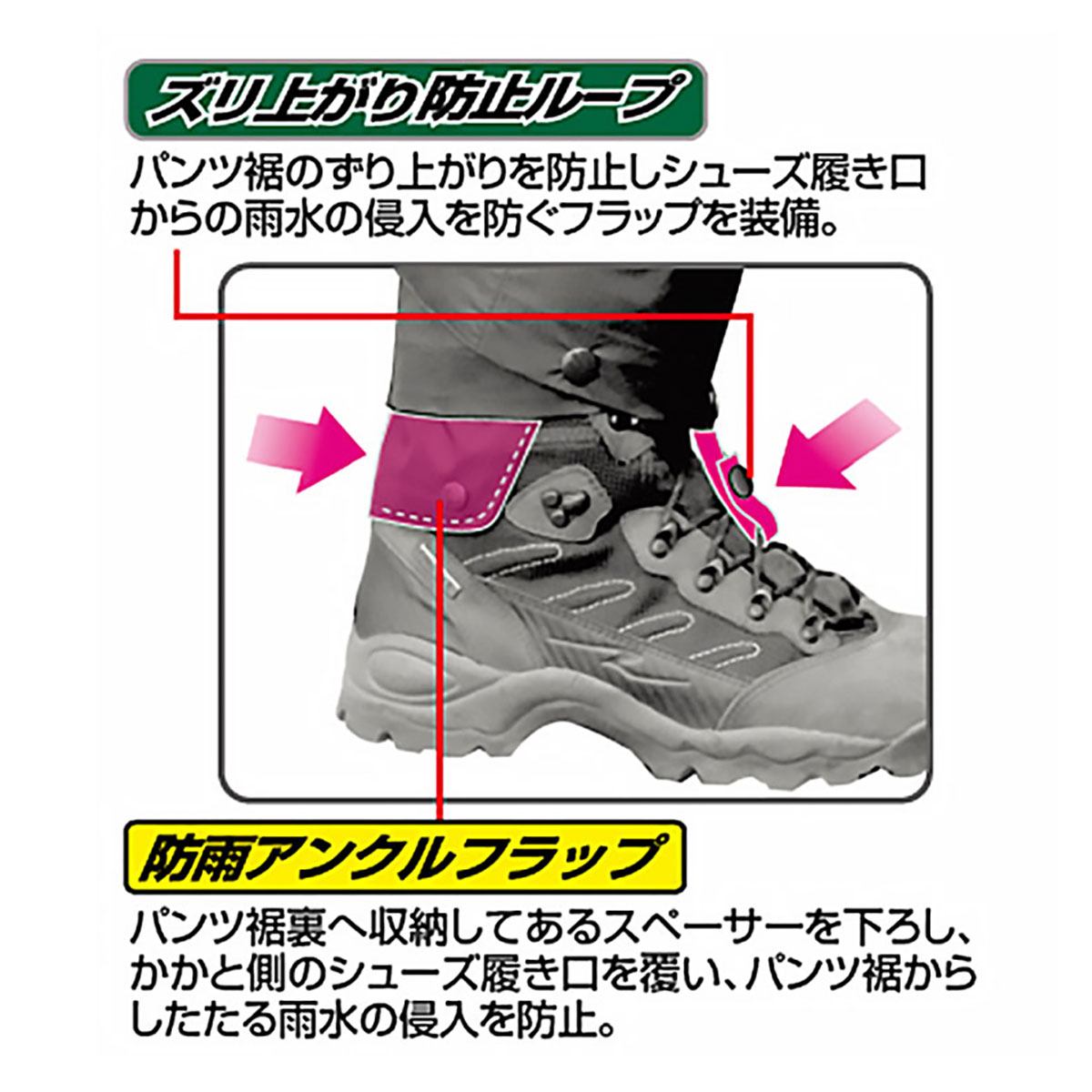 ほかにも当社の商品にはライディング姿勢をとったときにパンツの裾がずり上がり、シューズに水が侵入しないためのずり上がり防止ループ機能、同じくかかとからの侵入を防ぐ、防雨アンクルフラップ機能、エリにも後襟防雨プロテクターを装備しヘルメットとの隙間からの侵入を防ぐ、万全の雨対策を機能を装備しています。