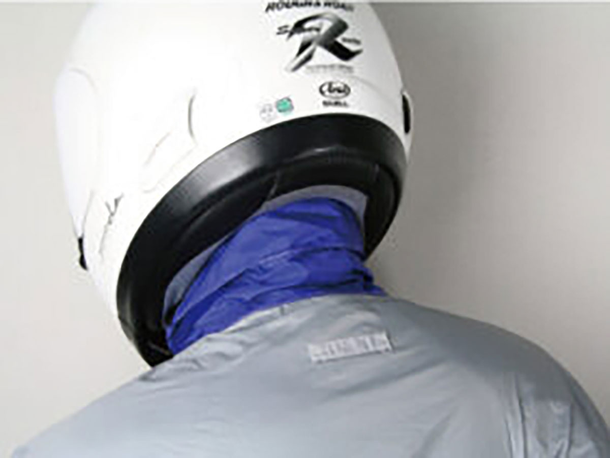 襟元はヘルメットを装着したときに隙間ができない高さとベルクロテープでしっかり隙間できないように閉められるものが良い。