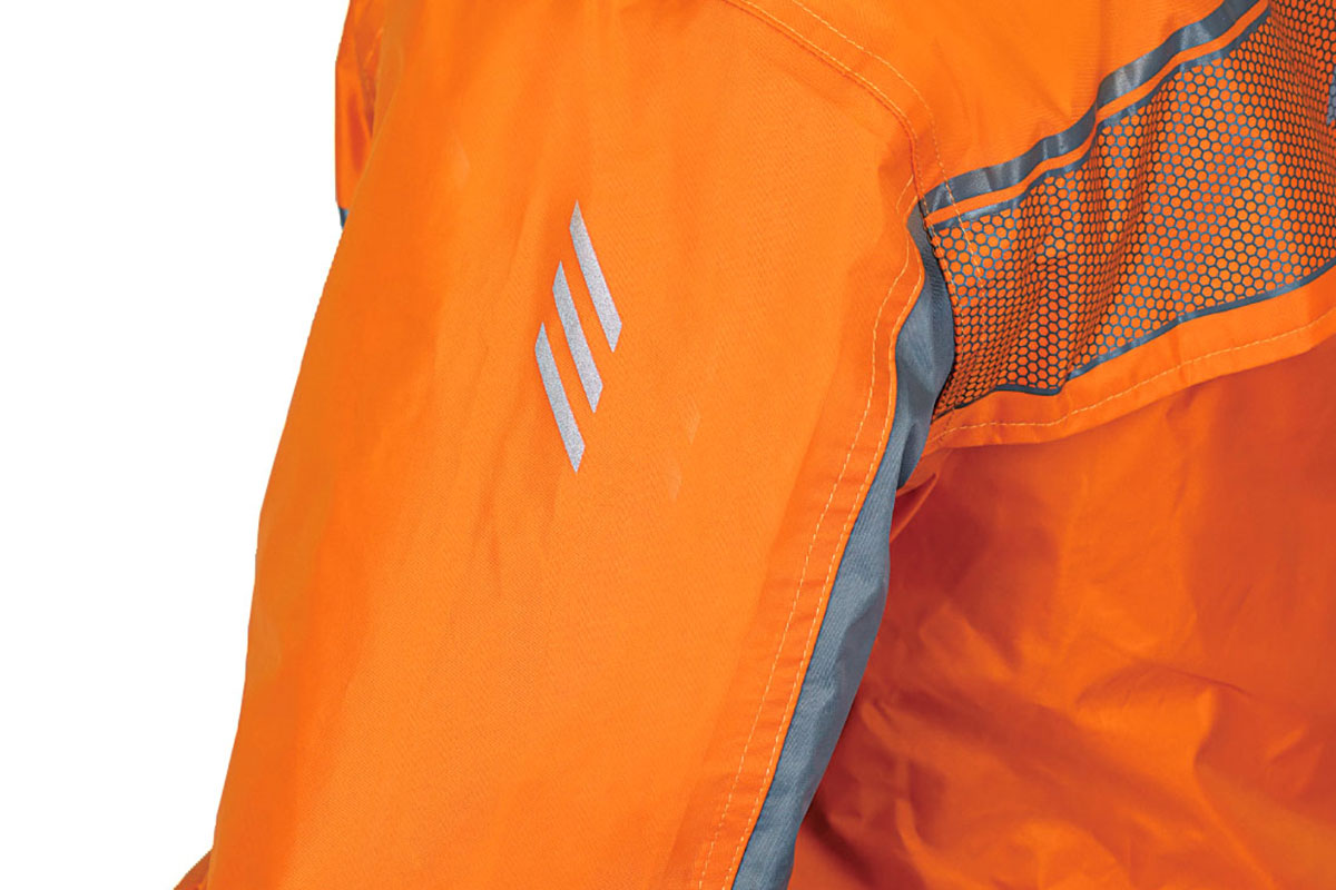 レインスーツは一般のものとは大きく違います。まず、走行中のバイクの場合は体の正面から雨を受け続けます。これは時速60kmで走行すると風速16m/sというかなり強い横殴りの雨を浴び続ける過酷な環境にあることを表しています。そんな環境下では以下のような機能が必要となってきます。