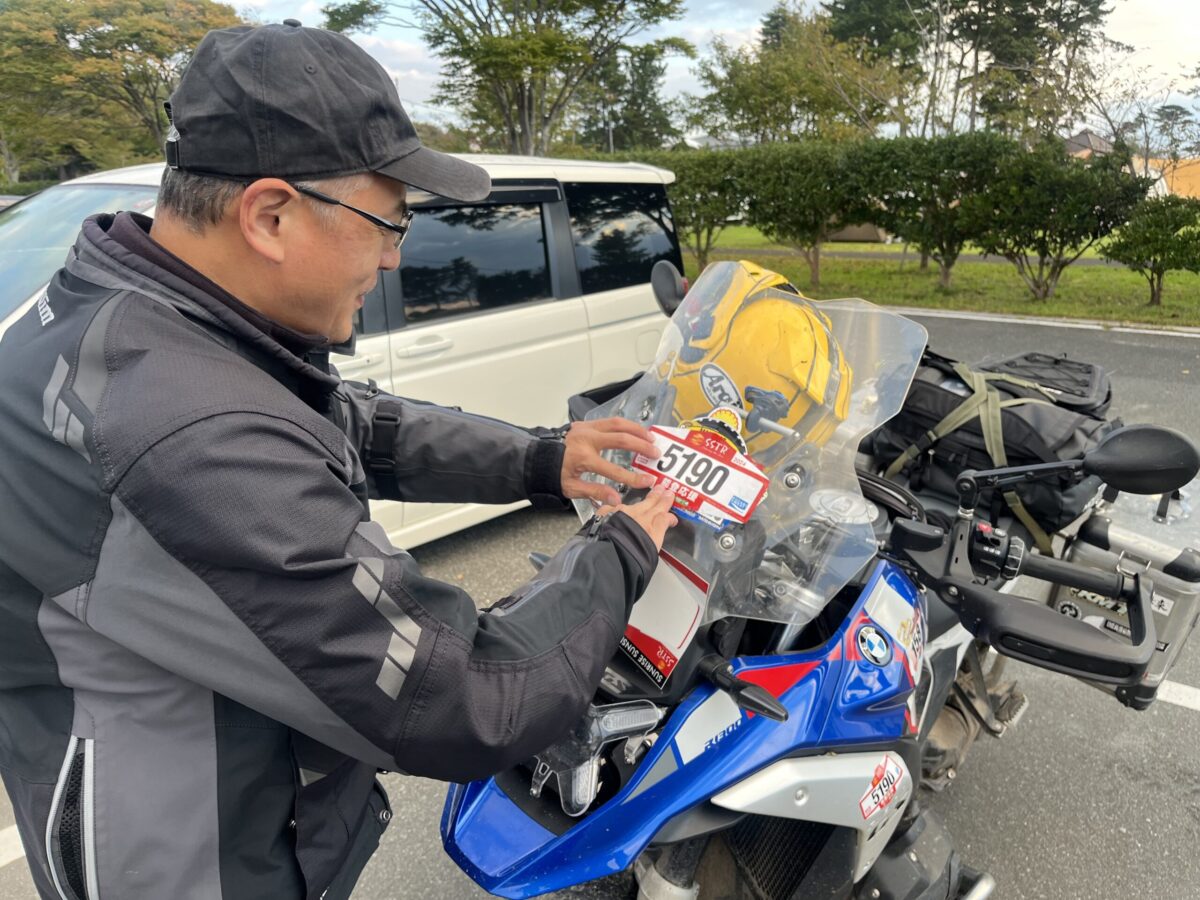 えーと、SSTRのゼッケンはこれだね~、とみちのくラリーのゼッケンの上からペタリ。ステッカーを渡し頑張ってください!と文字通りタッチアンドゴーで旅立つGSをお見送り……。ラリーのハシゴって、すげぇ。