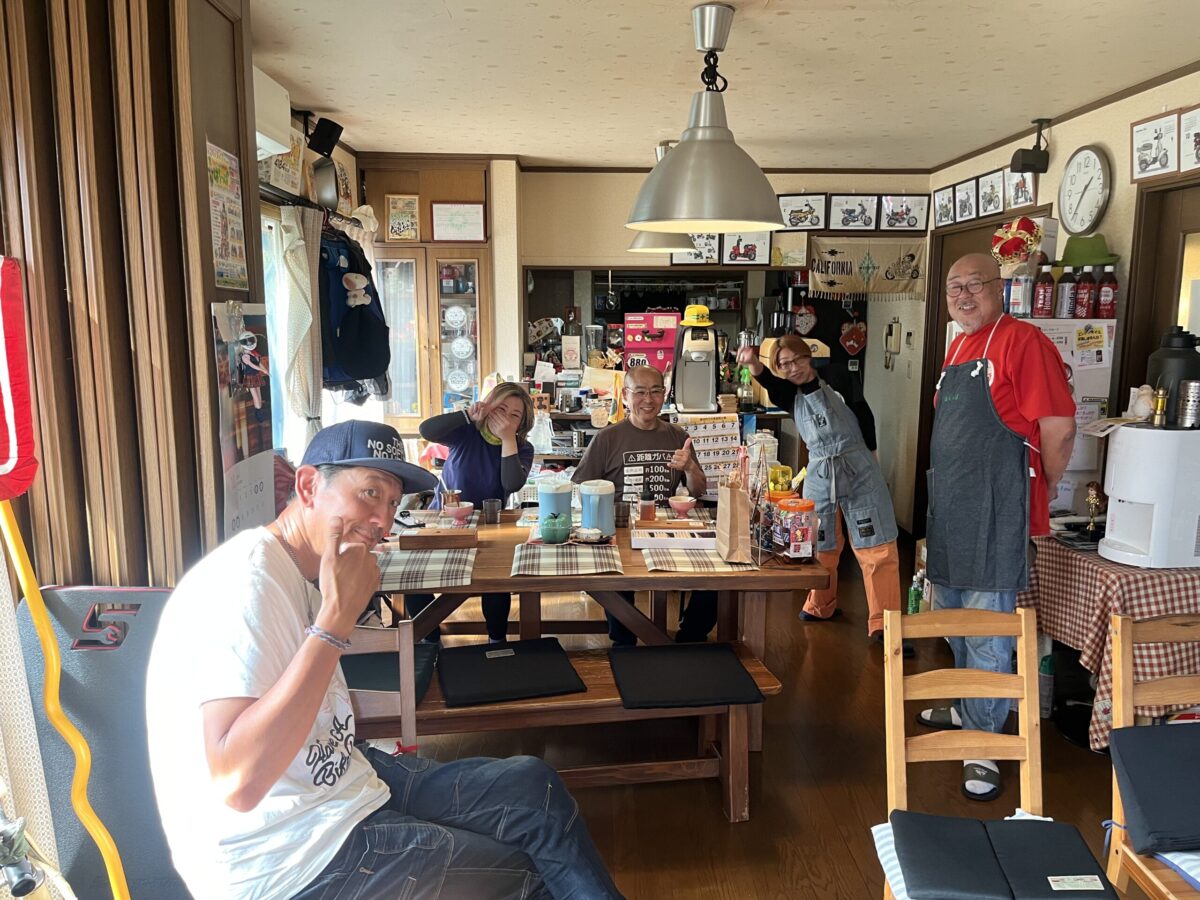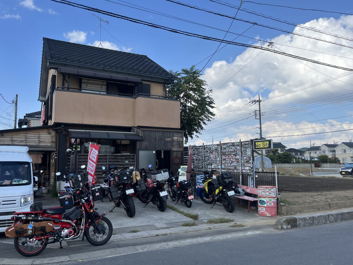 外壁や店頭のドラム缶に貼られたおびただしい数のSSTRゼッケンや魔改造されたカブ、ゴツイ旅バイク、建物横のガレージ、旭風防ののぼりなど、もしかしてヤバいバイク屋? と思うような外観のココはSSTR参加者には有名なカフェ。