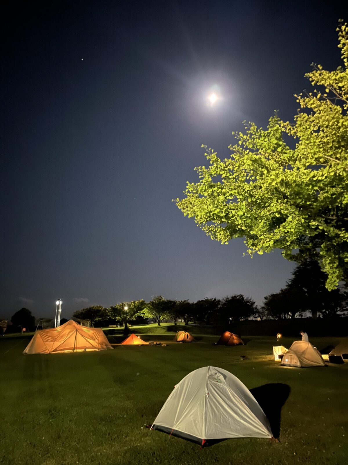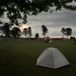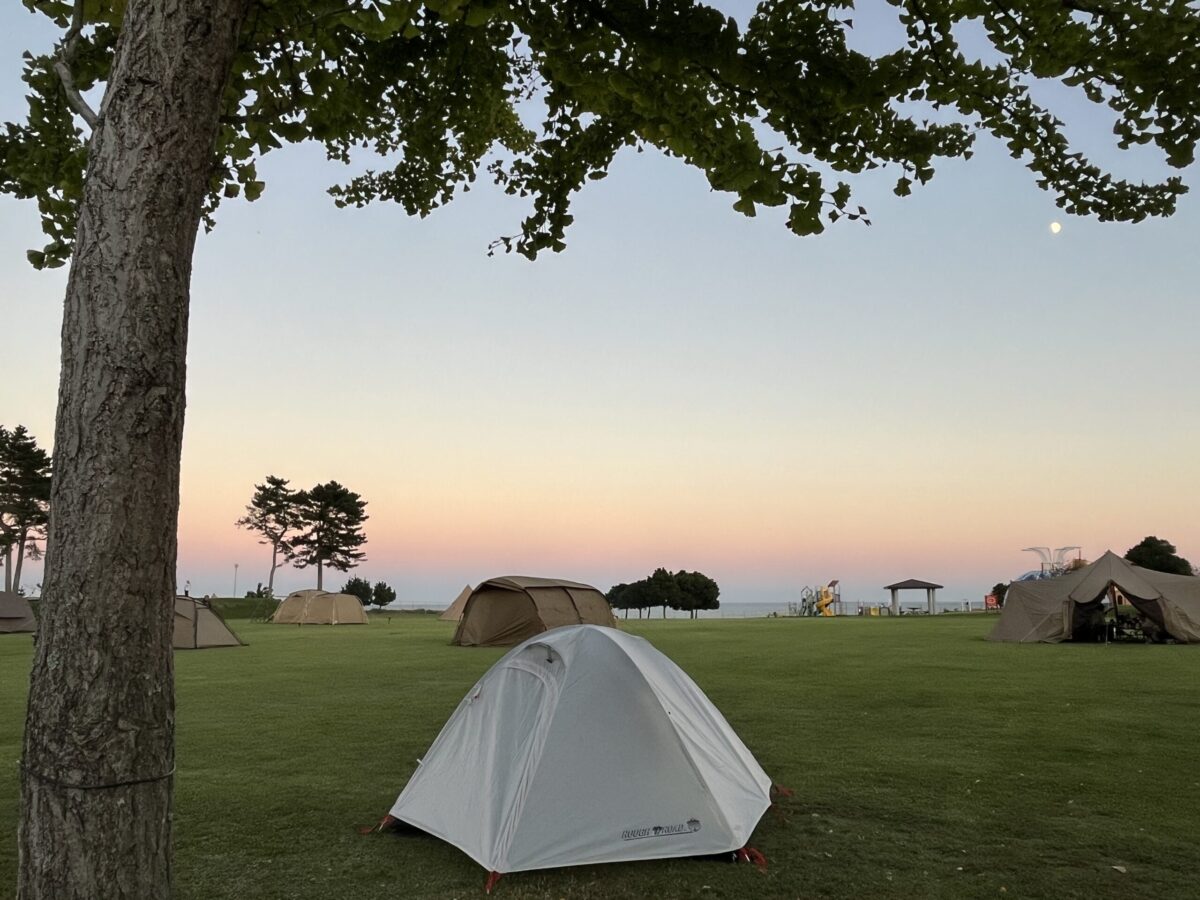 前回は出発時のことを考え併設の展望の宿 天神に宿泊も、そのとき見たキャンプ場の芝生の美しさに是非今回はキャンプしたいと思っていたので、なんとか日没前に到着し、今日の幕営地を確保しました。