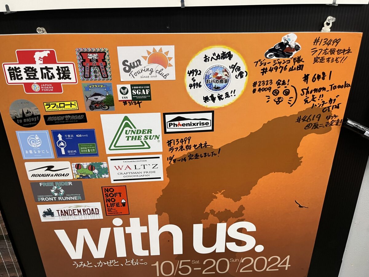 長かった非日常、SSTR2024が終わる……。大黒で急に感じ始めたSSTRロス。そうだ、旅の〆は横浜店のSSTRコーナーへ行こう。ここでサインボードに今回の旅でいただいてきたステッカー類を貼り、完走の報告サイン!