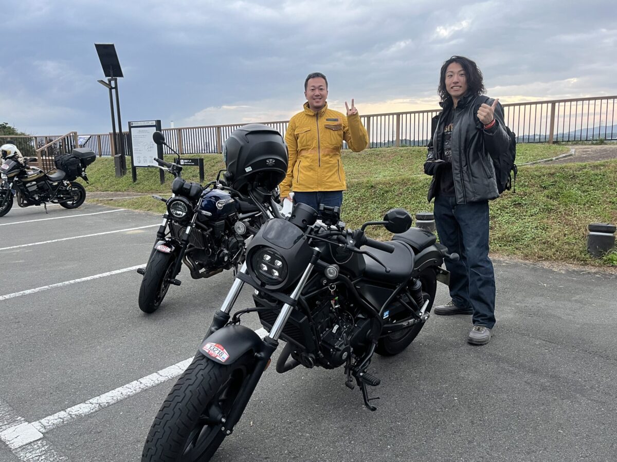 出発直後はこんなに晴れてたのに急に雨が降るって、やはり日本は広い(長い)……。どんどん東京に向かって南下してくると3連休最後の休日を惜しむようにバイクの数が増えてきます。茨城の友部SAでは色違いのVスト250SXに乗るベテランライダーにご挨拶。