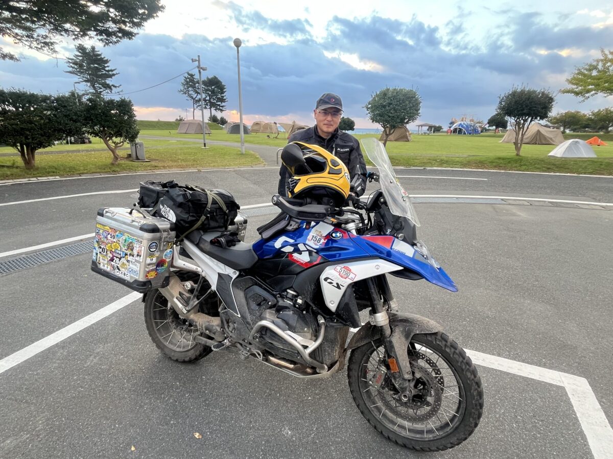 6時をまわり、目が覚めてしまったので、遠く海に差し込む朝陽を眺めているとパニアケースにステッカーがたくさん貼ってあるタダモノならぬ気配のR1300GSがやってきました。