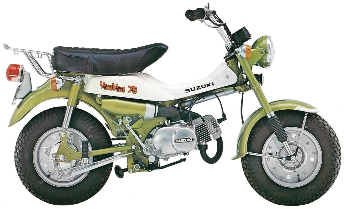 1972年に、ヤマハから「GT50・80(ミニトレ)」も発売され、レジャーバイクは三つ巴のカオスな状態になります。スズキは相乗効果による人気にニンマリし、1972年に125ccと50cc、1973年には75ccと、派生モデルを発売しました。バンバン90のキャッチコピーは「新しい世界を見つけよう」でしたが、バンバン75は「地球に乗るならバンバン」と意味不明。バンバン50に至っては、花柄シート仕様を発売するなど、明後日の方向に向かいました。