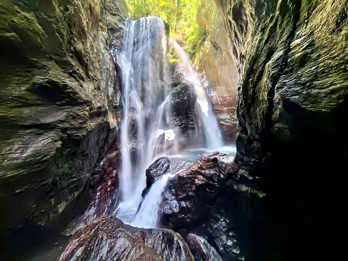 以前はロープの張られた急斜面の階段を下りて向かった、秘境感たっぷりの神秘的な滝壺「にこ渕」[ツーリングマップル中国・四国 P.77 C-6]。あらたに遊歩道が整備されて訪れやすくなりました。協力金100円必要ですので小銭をお忘れなく