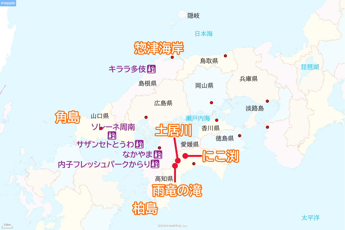 ◆水辺・海辺で見た素敵な景観(新柏島大橋/惣津展望台/にこ渕/池川大橋/雨竜の滝(中津渓谷)