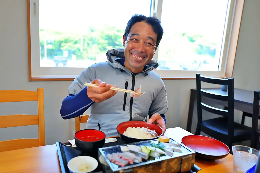 撮影は順調に進んで、「☆幸せの海鮮丼☆ つのしま食堂」さんで楽しいランチです。デザートは9月のコラムで紹介した「角島プリン」でした