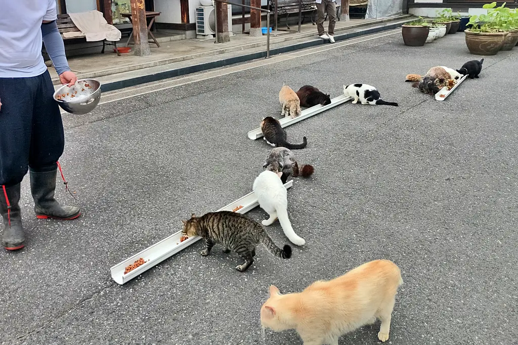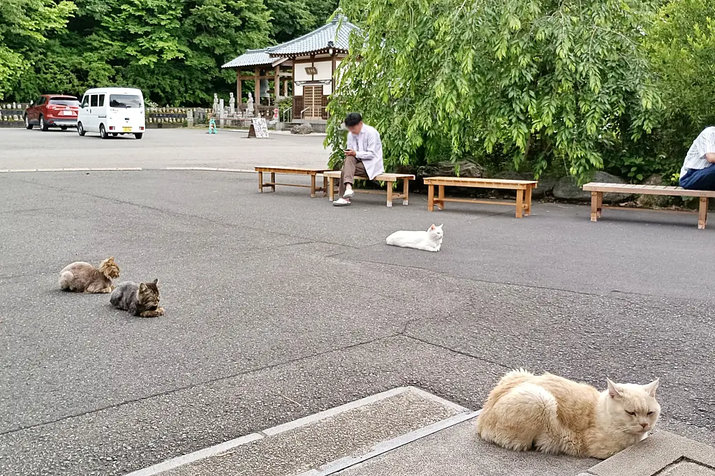 きちんとお世話もされていて、不妊手術はもちろんのこと、病気の子は別室で隔離治療されているし、寝床も用意されている。猫たちは1日2回、お寺の人にご飯ももらっていて、たくさんの猫が一堂に介するため、その時間を狙って来る猫好きさんも多い。